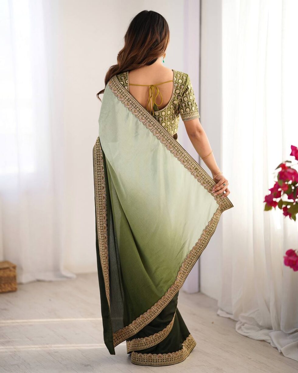 Chinon Silk saree with thread and sequence lace work, 5.5M cut, includes unstitched blouse. Priced at ₹4,399.00.