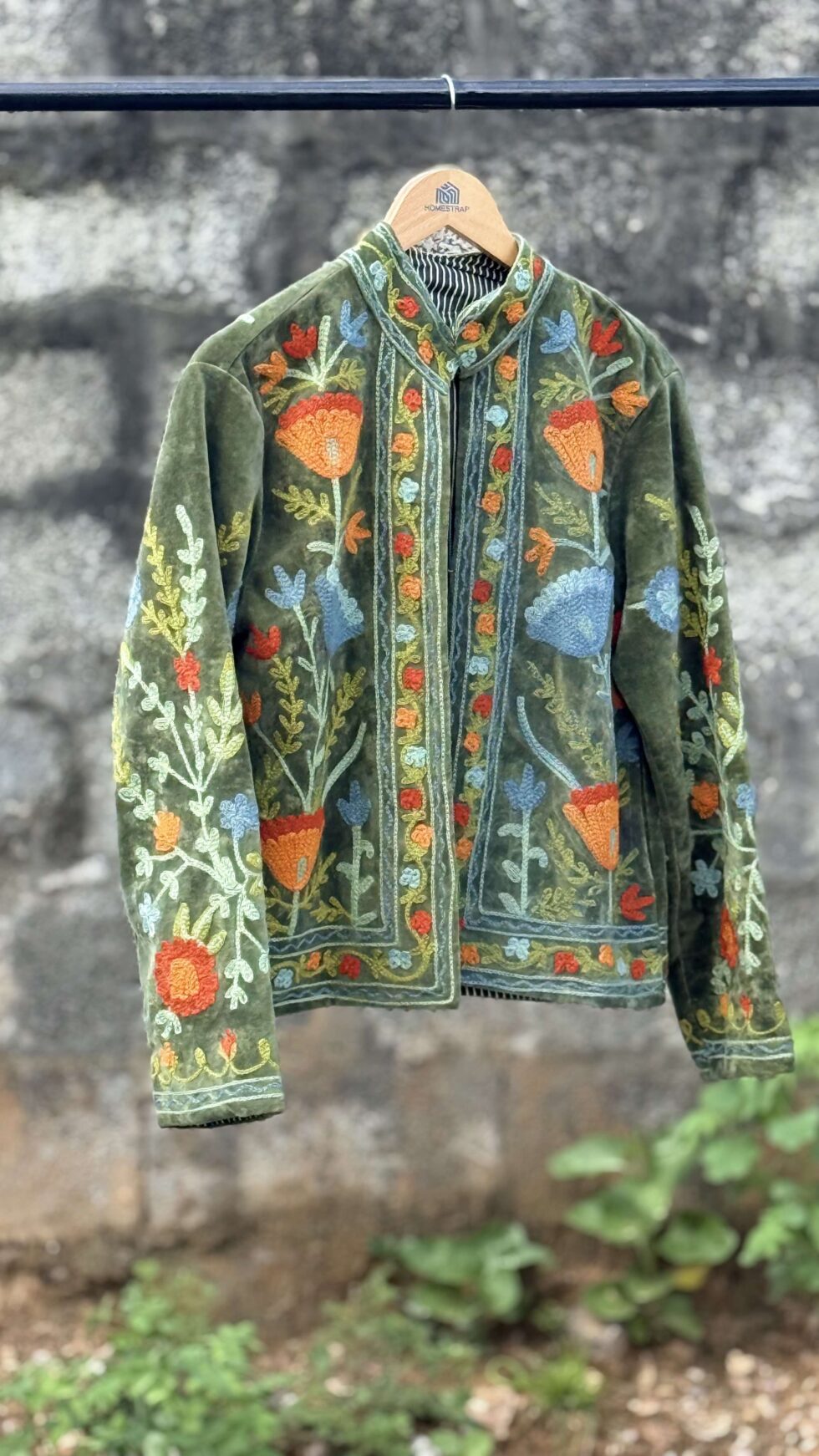 Luxurious velvet jacket featuring intricate Suzani embroidery. Perfect blend of elegance and tradition โ ideal for festive and ethnic occasions.