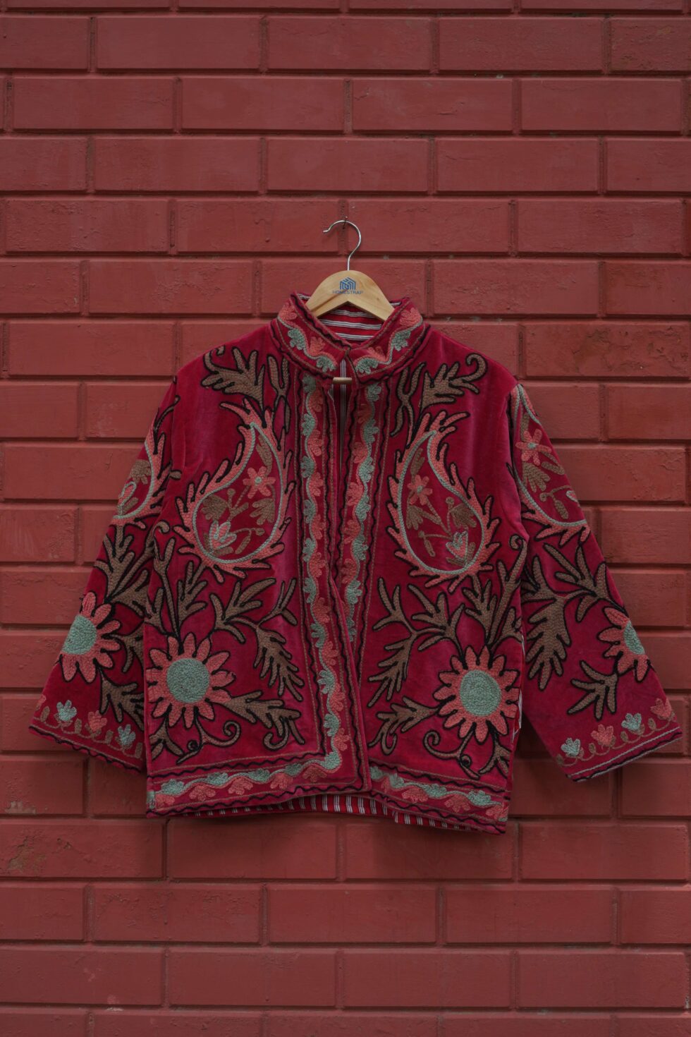 Womens Red Velvet Embroidered Jacket with Floral Design
